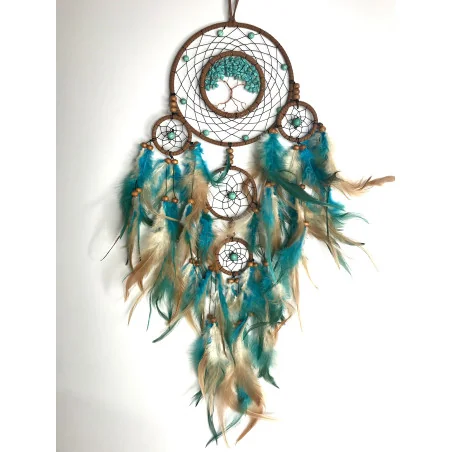Symbole de protection, d’harmonie et de sagesse, cet attrape-rêves allie la puissance de l’Arbre de Vie à la douceur des plumes turquoise et sable.