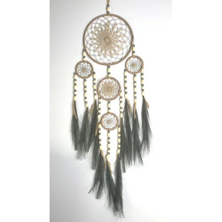Tissé de fils gris et sable, cet attrape-rêves unit la sagesse de la Terre à la légèreté de l’Air.