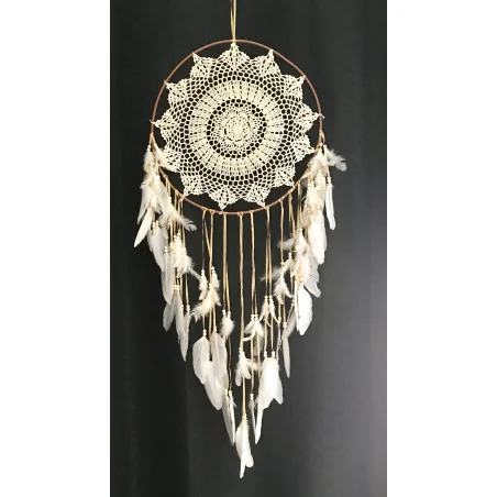 Matériaux : véritable dentelle crochetée à la main, plumes naturelles blanches, perles en bois brut, rubans beige clair, cadre métallique doré vieilli.