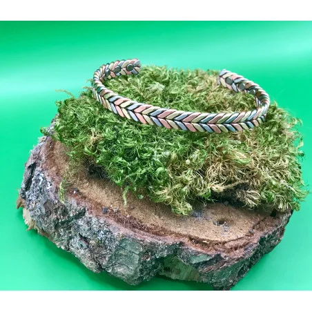 Ce bracelet magnétique ajustable est réalisé dans un superbe tressage tricolore mêlant cuivre, laiton doré, et métal gris. Sa finition tressée lui donne un style chaleureux, ancestral et authentique, parfaitement adapté à la mode bohème, énergétique ou spirituelle.